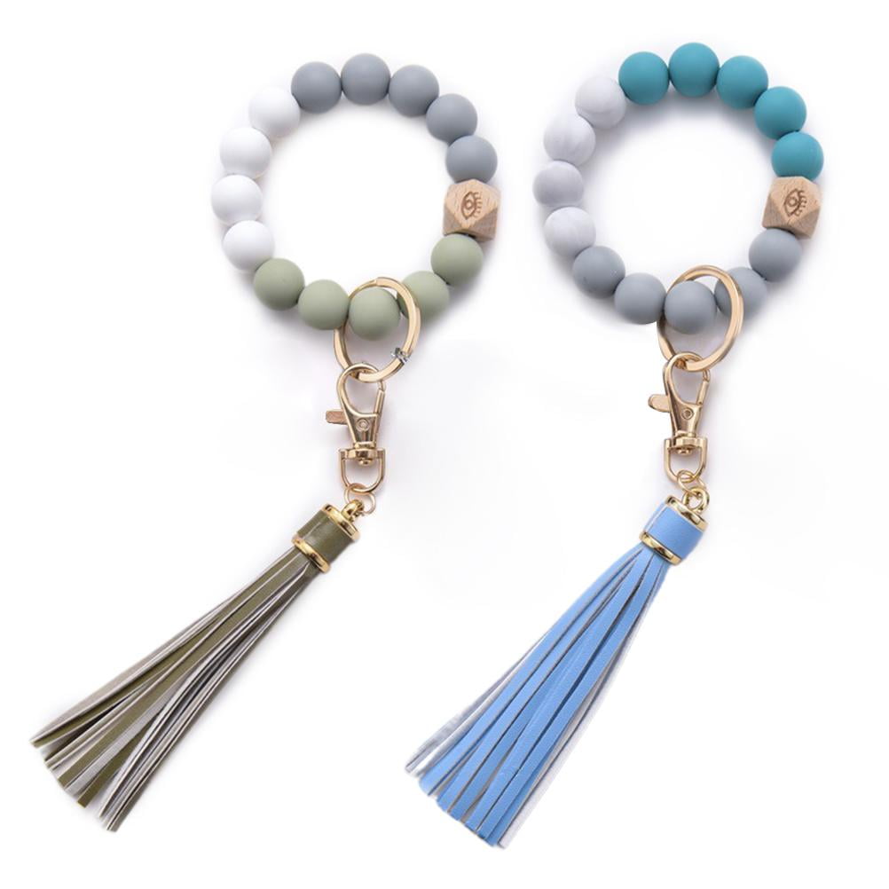 2 Pieces Wristlet Keychain Bracelet Beaded Silicone Wood Bead Bracelet For Women Girl Keychain Ring Bead Bangle Walmart Com